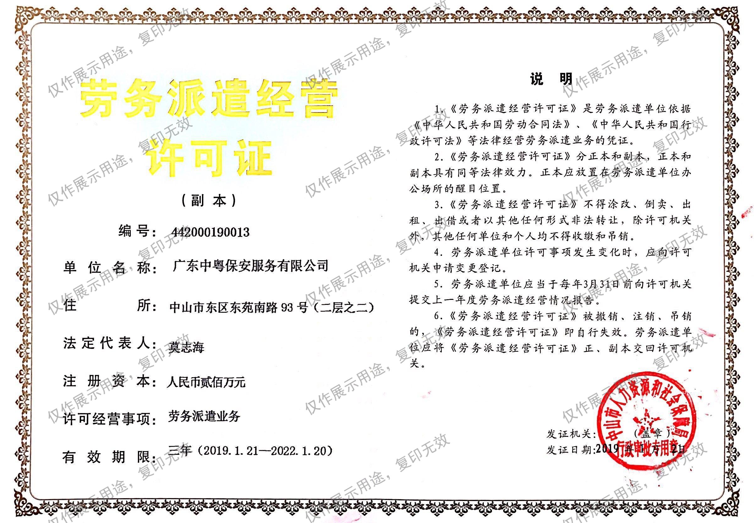 主頁  > 資質榮譽  > 資質證書  > 勞務派遣經營許可證