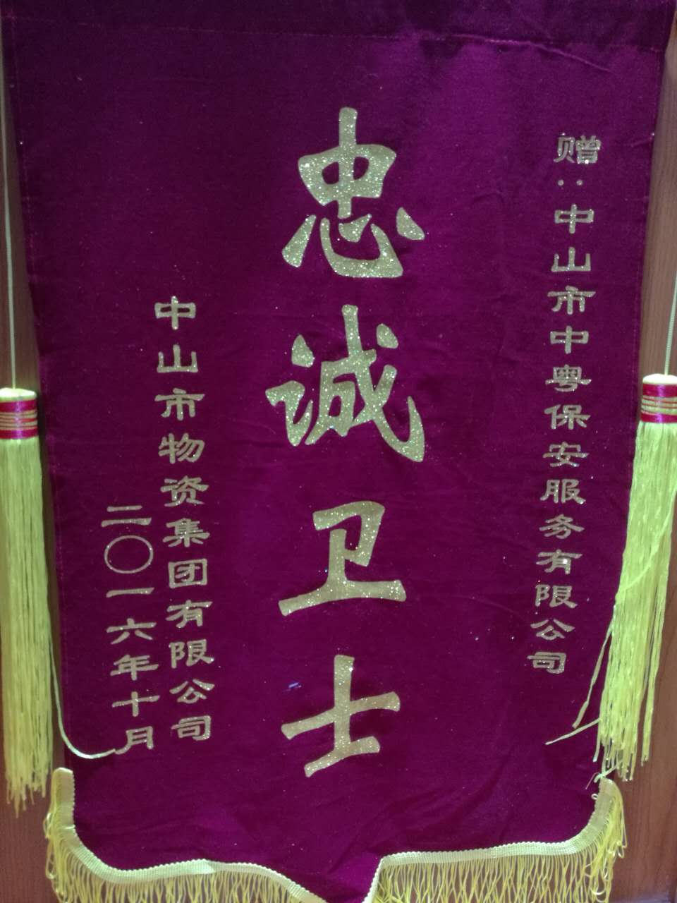 2016年10月,中山市物資集團有限公司贈中山市中粵保安服務有限公司“忠誠衛士”錦旗。
