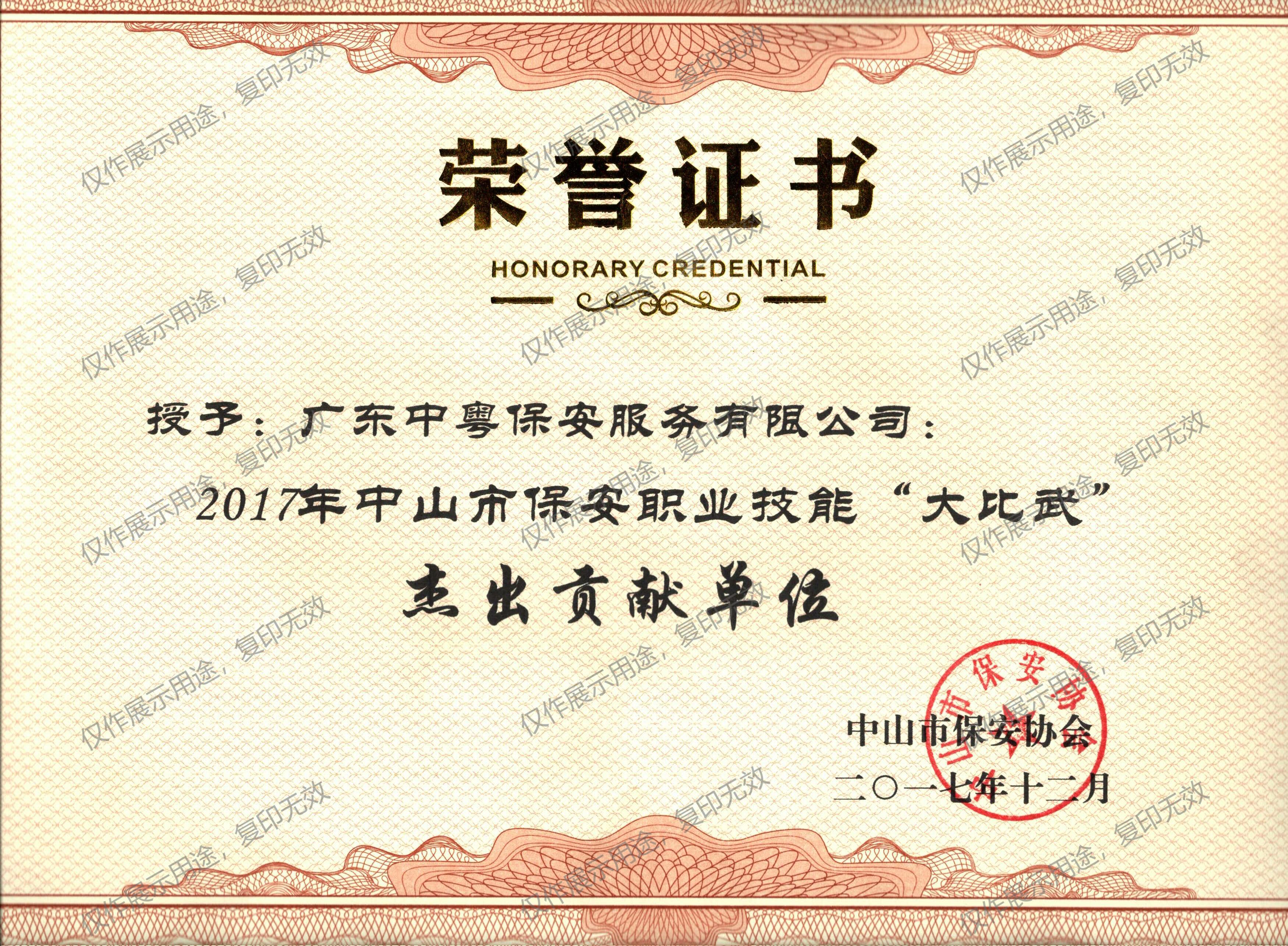 2017年12月,我司獲得2017年中山市保安職業技能大比武杰出貢獻單位榮譽證書。